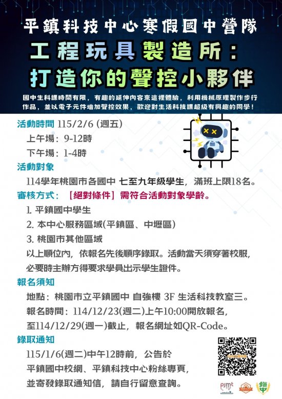 | 七、 | 錄取公告:1月6日(週二)12時前公告於平鎮國中官網與本中心粉絲專頁。 |